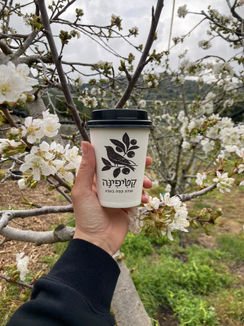 A boutique coffee cart in Neve Ativ, seamlessly blending into its natural surroundings. Nestled by cherry orchards open for public picking, it offers fresh salads, sandwiches, and treats crafted from the orchard's harvest. The gentle birdsong that fills the air is an integral part of the experience, shaping the visual and sensory identity of the space.